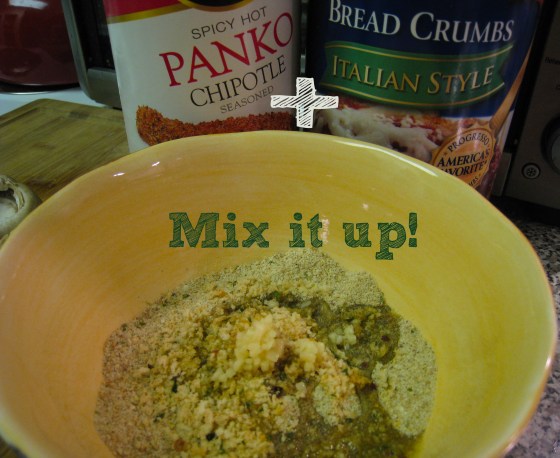 - In a shallow bowl, add a few shakes of Italian seasoned bread crumbs, 1-2 shakes of the Chipotle seasoned panko crumbs (more or less depending on your spice tolerance).
